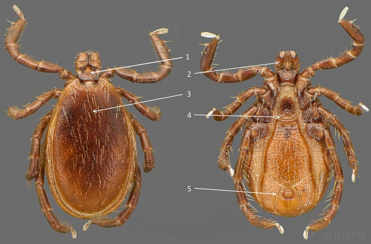 La femelle se reconnait grâce à son bouclier qui ne couvre qu’une petite partie de son corps, permettant à son abdomen de s’étendre lorsqu’elle se gorge de sang.