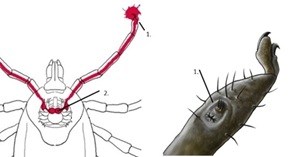 Grâce à ses pattes, elle peut se déplacer aisément, utilisant à la fois ses griffes et ses ventouses, tout en s’agrippant à presque tous les types de supports. En outre, elle possède des organes sensoriels nommés organes de Haller, localisés sur ses pattes avant (1.), lui permettant de détecter divers paramètres environnementaux tels que la température, l’humidité, le CO2 et les odeurs, tout en identifiant la présence d’un hôte potentiel. Toutes ces informations sont ensuite transmises au lobe olfactif (2.).